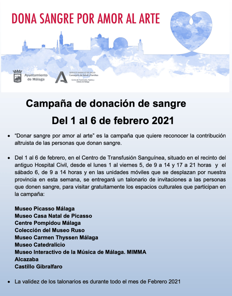Durante los próximo días, del 1 al 6 de febrero, todas las personas que donen sangre en el Centro de Transfusión Sanguínea de Málaga, situado en el recinto del antiguo Hospital Civil recibirán invitaciones para visitar gratuitamente durante el mes de febrero de este año los espacios culturales que participan en la campaña: