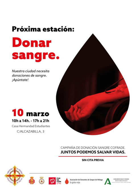 Bajo el lema “Próxima estación….Donar Sangre” anima a participar y a vivir en estas semanas previas a la semana santa , un tiempo de cuaresma ,especialmente solidario, la propuesta es ayudar para que no falte sangre en Málaga, así pues, la Cofradía de Estudiantes abre sus puertas y animan participar en esta acción solidaria que se llevará a cabo, el próximo viernes 10 de marzo en la Casa hermandad de Estudiantes (C/ Alcazabilla,3),en horario de 10 a 14 y 17 a 21 horas.